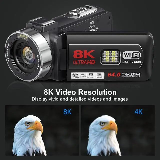8K Video Camera Camcorder 64MP YouTube Vlogging Cameras IR Night Vision WiFi Webcam Camcorders with 18X Digital Zoom 3.0Touch Screen Stabilizer, Mic, 64G SD Card, Remote Control and 2 Batteries