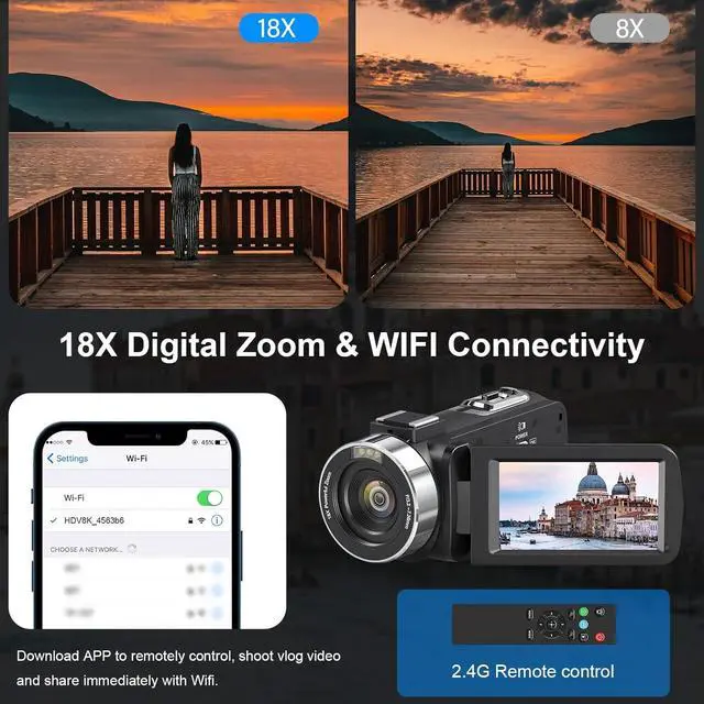 Wi-Fi Connection & 2.4G Remote ControlWith the "Hello Cam" application,this 8K camera can connect to your Android/iOS smartphone or tablet via Wi-Fi. This enables you to remotely control the video camera,view images,and quickly share videos to social media platforms like YouTube,making it ideal for vlogging. Moreover,the upgraded 2.4G 360° wireless remote control allows operation from up to 50 feet away and facilitates multi-angle shooting.