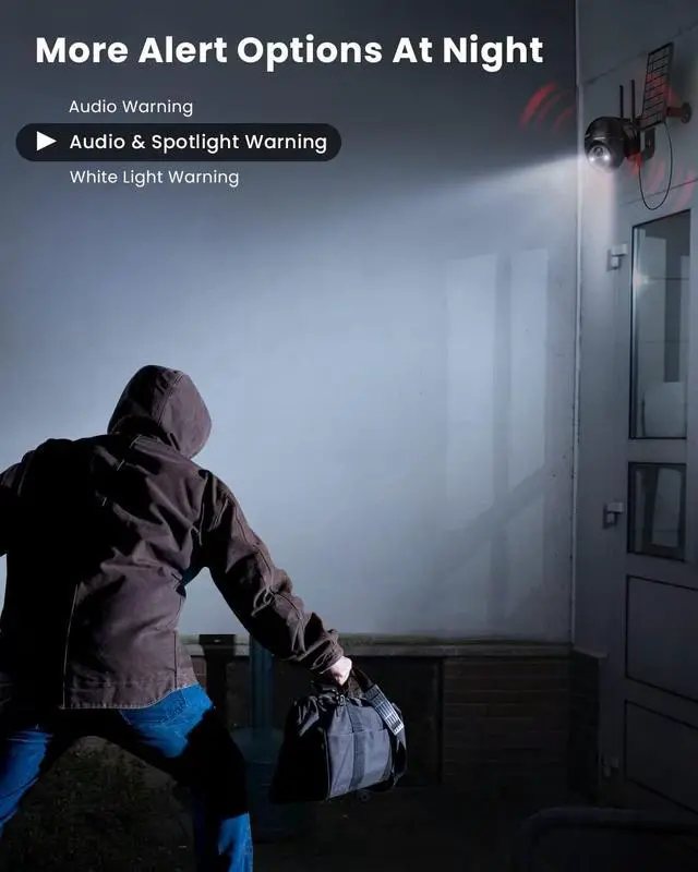 Smart PIR & Custom Alarm AreaThe wireless security camera outdoor is upgraded with PIR Motion Detection AI algorithm, which can distinguish between people, pets, vehicles or packages, and supports human motion detection, which can reduce the false alarm rate by up to 90%. You can also customize alarm zones and modes, and adjust 10 levels of alarm sensitivity. Reasonable adjustments are made at any time based on the real on-site conditions of your home and will not disturb your normal life.