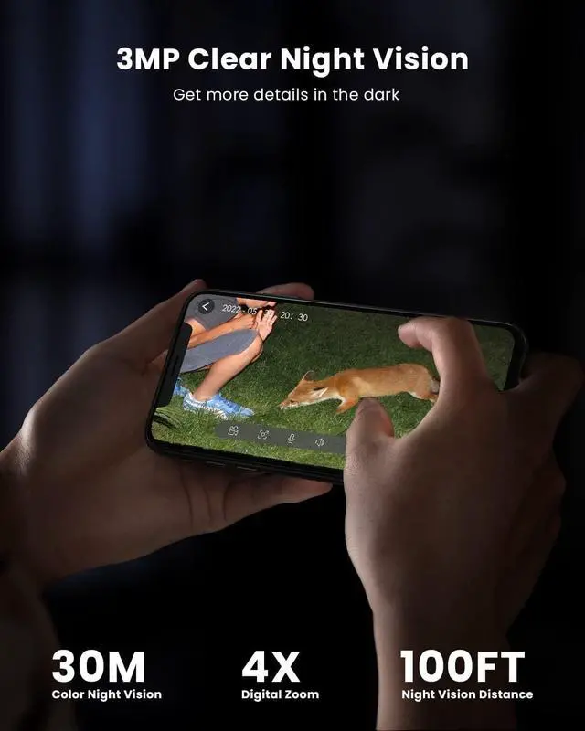2K HD Color Night Vision & 360° Pan and Tilt ControlThe camera has a resolution of 2048 x 1536, which is 1.5 times more detailed than a 1080p camera. Built-in 2 white lights provide you with clearer color night vision. View high-definition images even in the dark of night to effectively identify potential threats. With a 355° pan, 120° tilt and 4x digital zoom (no auto-tracking), the security cameras wireless outdoor provides 360° surveillance to protect your home.