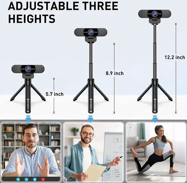 [Three Adjustable Heights] The flexible web camera tripod features three adjustable heights ( 5.7 - 12.2 inches). When you need to video conference, you can adjust the tripod to 5.7 inches, a height at which others can see your face up clearly. When you need to stand up for a group presentation or explain a PPT, set the tripod to 8.7 inches, with the upper half of your body visible. When you need to shoot the whole body, you can extend the tripod to a maximum of 12.2 inches.