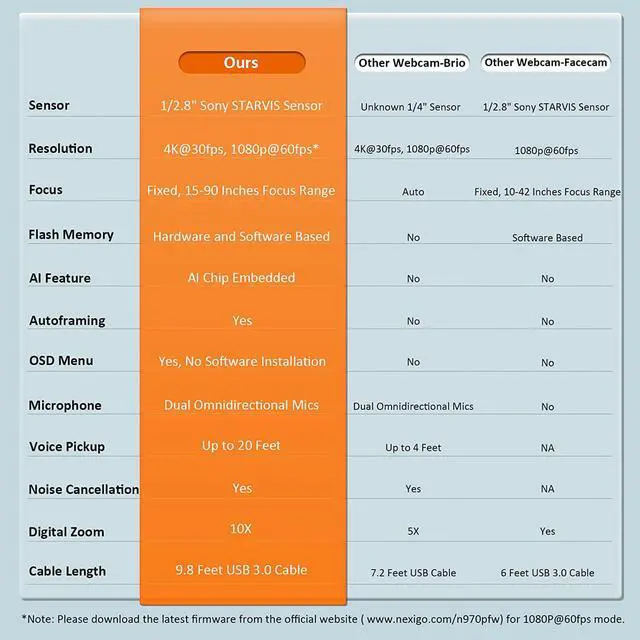 OSD Menu & Flash MemoryDirectly save any specific settings to the webcam itself for instant recall, even when switching between computers or devices. With built-in OSD menu, you can adjust all the image parameters without installing any software. It's perfect for work computers and corporate environment. NexiGos product algorithms and firmware are stored and run within its hardware with edge computing technology. This ensures top-level data security and privacy protection.
