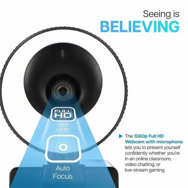 With the VisionTek VTWC40 Webcam, online classroom learning, video chatting, and live-stream gaming is a breeze. This 1080P Full HD webcam with omni-directional dual microphones captures video in perfect detail and vibrant color. With its autofocus lens and 96-degree viewing angle, you'll be sure to look your best during every video call. The built-in ring light with two brightness controls keeps you well lit even in low light. Whether youre doing online learning, live-stream gaming, or video conferencing from the office, your webcam is compatible with most software, including MS Teams, Zoom, Skype, and more.