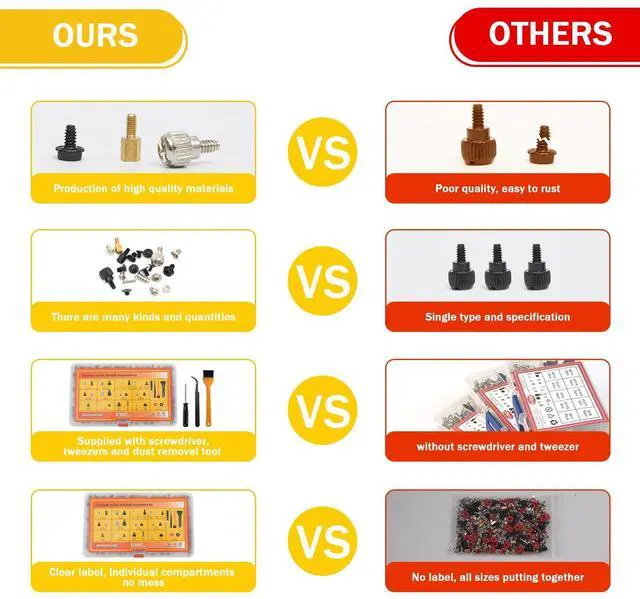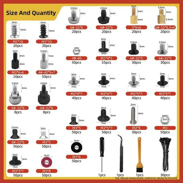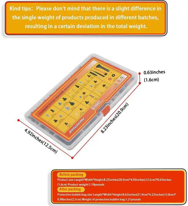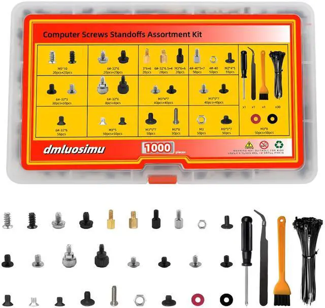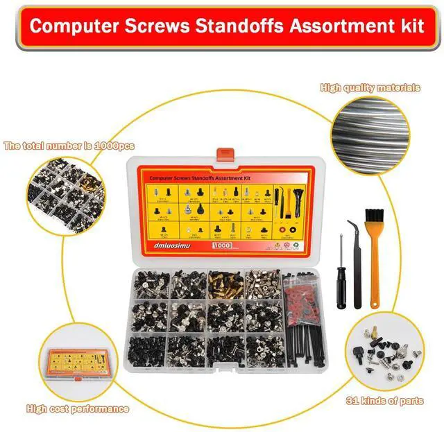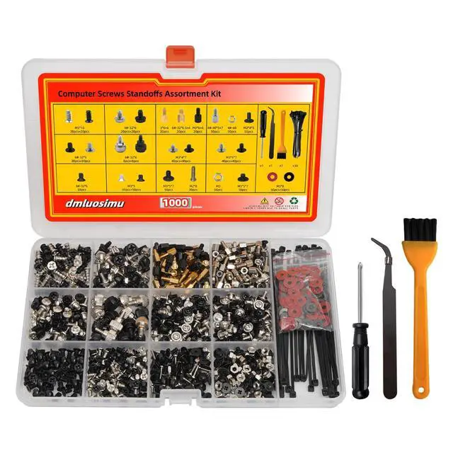 The dmluosimu 1000pcs Computer Screw & Standoff Kit is an essential collection of hardware components for building, repairing, and maintaining PCs. With a comprehensive assortment of screws, standoffs, washers, and tools, this kit ensures you have the right components for any PC project.