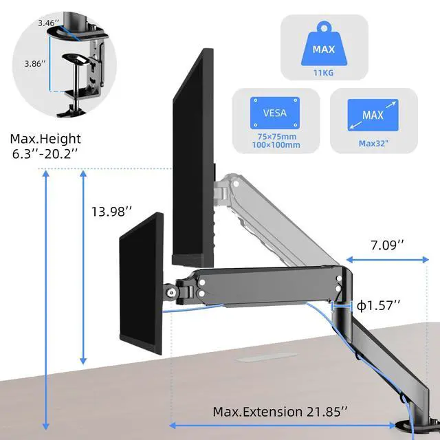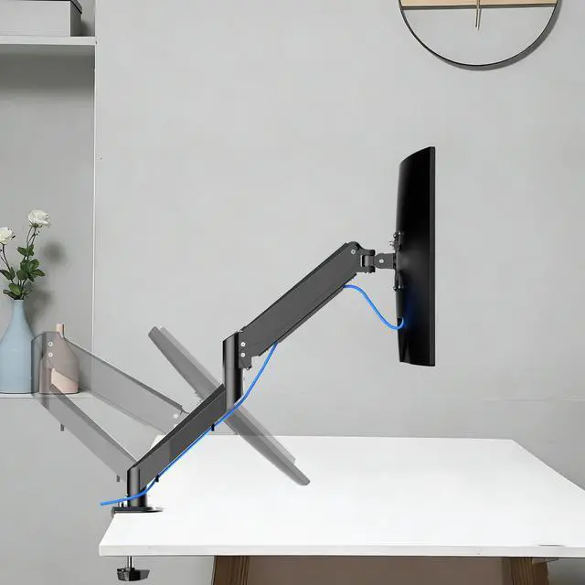 Gas Spring Monitor Arm 32 Inch,Adjustable Single Monitor Desk Mount with Swivel/Tilt/Rotation,Computer Monitors Stand Holder with Clamp/Grommet Mounting Base, VESA Mount Bracket