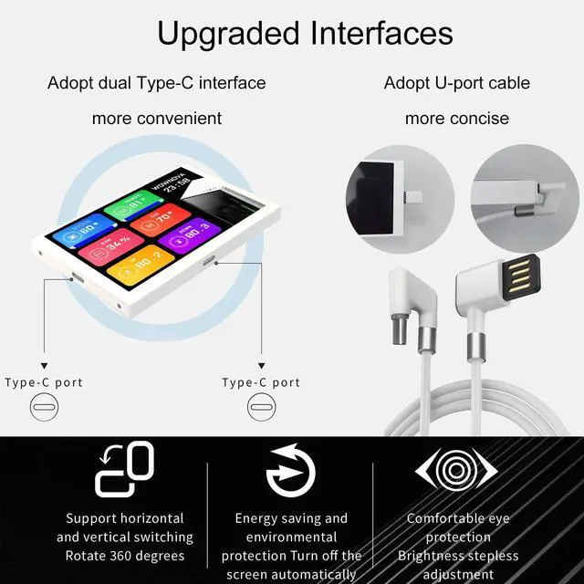 Great Viewing Angles & Accurate Information IPS full view. 3.5inch mini screen. Display area: 1.93*2.91". Overall size: 2.17*3.35". Resolution: 320*480. Thickness: 0.31". Shell material: metal. pc accessories, pc parts. Dual Type-C interface and U-port cable, more convenient and concise