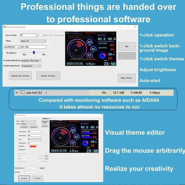 Simple and Feature-RichCustomizable screen layout. Horizontal and vertial screen switching. Visual theme editor: drag the mouse arbitarily to realize your creativity. Energy saving & environmental protection. Auto-start. Turn off the screen automatically and Comfortable eye protection Brightness adjustment.
