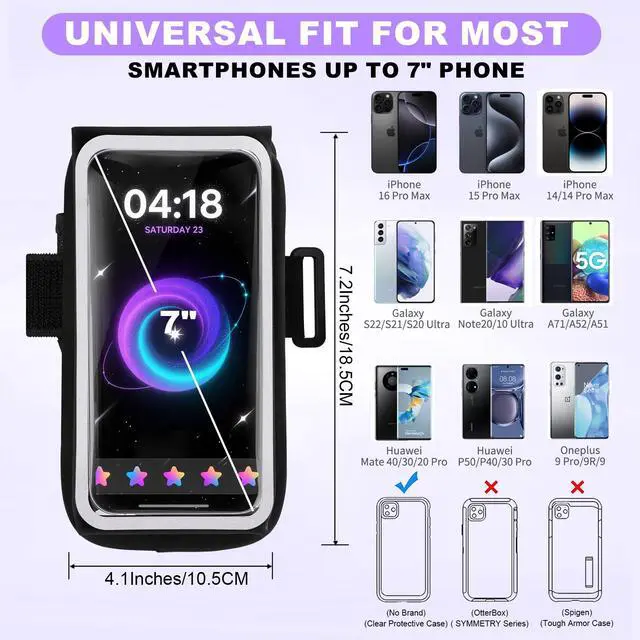 Universal Fit & Advanced ComfortDesigned for virtually any smartphone up to 7 inchesfrom the latest iPhone 17 Pro Max to Samsung Galaxy S23 Ultra and beyond. Crafted with premium lightweight materials featuring moisture-wicking and breathable perforations, this cell phone armband keeps you cool and dry no matter how intense your workout gets