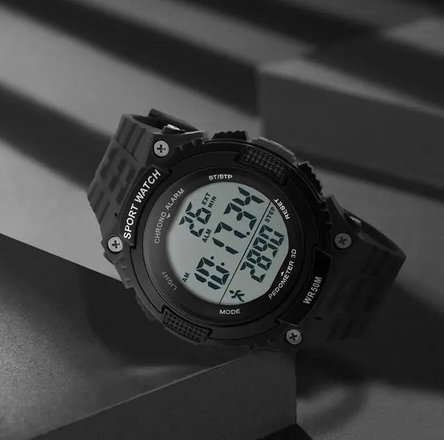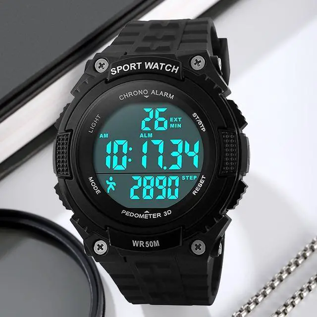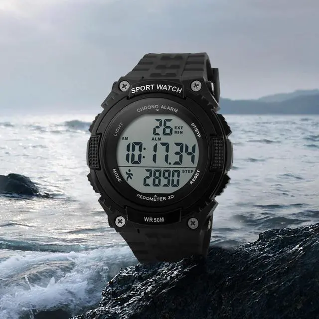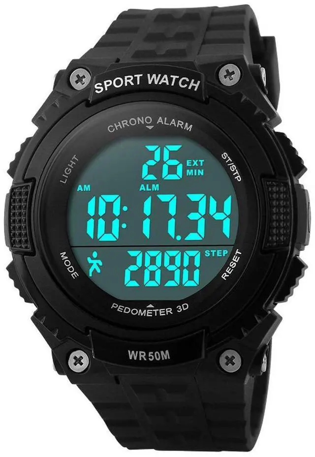 Auto Date, Alarm,Water Resistant,LED display,Shock Resistant,Stop Watch,Back Light, Pedometer, Shock Resistant, 50M Water Resistant. These functions are useful for exercising.