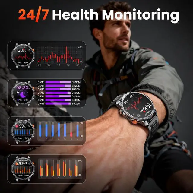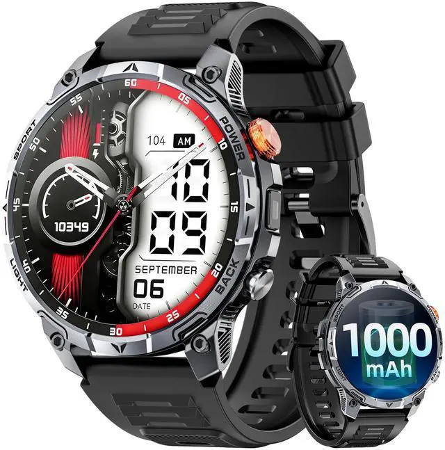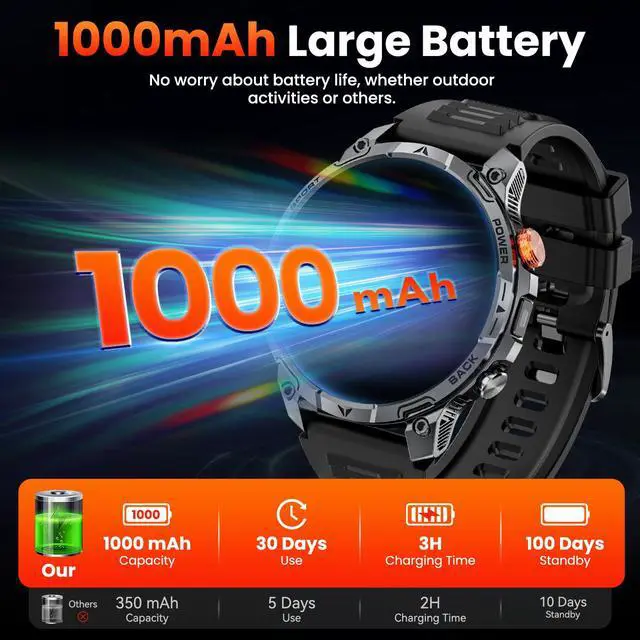 1000mAh Large Battery, Extra-Long Battery LifeThis smartwatches was equipped with a battery capacity of up to 1000mAh, which is four times that of traditional smartwatch.Lasting 30 days in normal mode or providing over 100 days of ultra-long standby time. It is ideal for those who love outdoor adventures and frequent travel, as its powerful performance you don't need to worry about frequent charging. It can be fully charged in just 3 hours.At the same time he can provide more than two hours of emergency lighting for the flashlight.keeping you no worries and ready for any adventure.