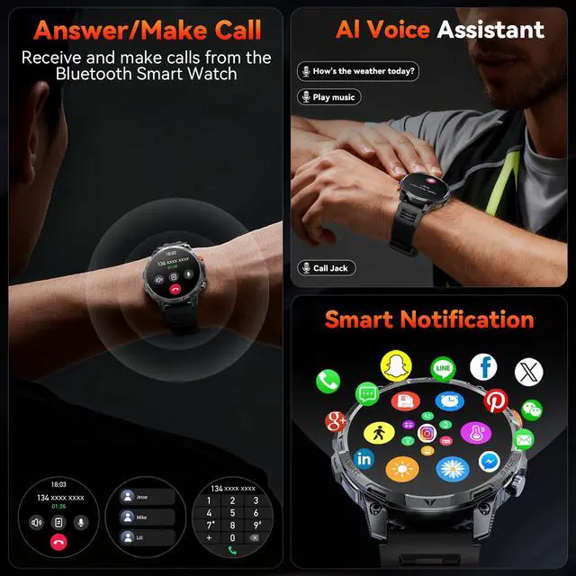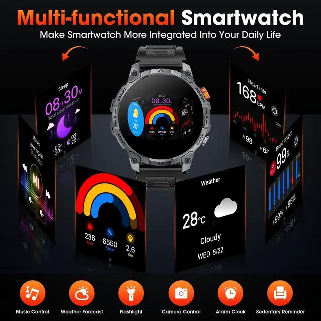 1.75" HD Large Full Touch Screen with Powerful Flashlight Smart watch large 1.75-inch HD touchscreen gives you a large, high-definition content display with adjustable brightness, responsive touch controls and smooth operation. (Note: This watch is better suited for people with larger wrists.).Military watches for men built-in LED light brightens up the darknessideal at night, in the basement, or on hikes. You can also instantly activate the powerful integrated flashlight: light the way, find your keys or handle emergencies with just a tap.Whether for adventure, work or life's emergencies, this smart watches for men is perfectly suited for the job.