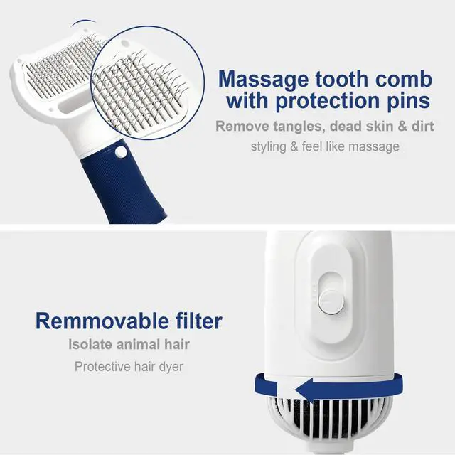 Dryer & Brush in OneThis 3-in-1 dog hair dryer is combined hair dryer with hair comb brush, it can make much easier to dry your pet, perfect for use after baths, rainy walks, or during cold weather, it provides warmth and comfort while grooming your dog.