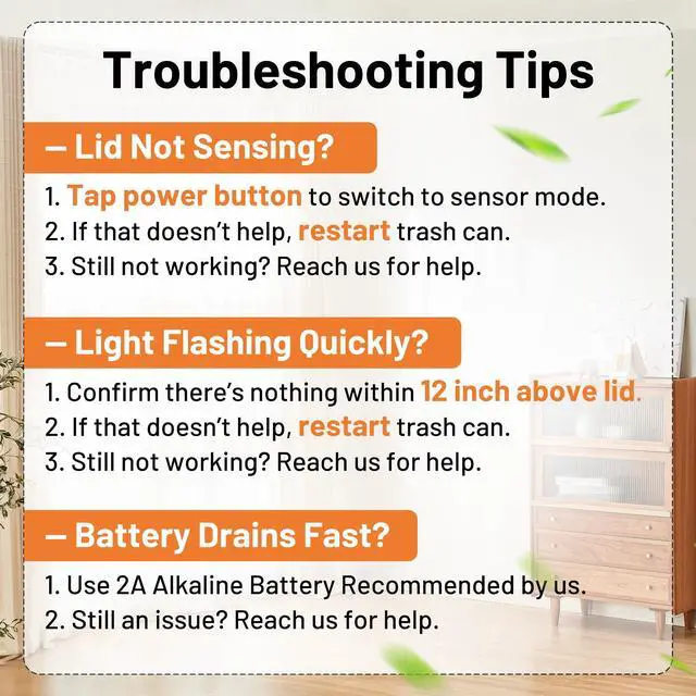 A: There should be no objects within 23 inches (60 cm) above the motion sensor of the trash bin. If the indicator light is flashing, it means there is an object affecting the sensor. Please remove any objects or move the trash bin.