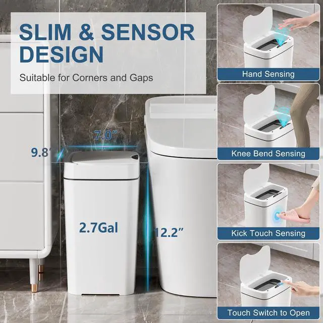 A: The 2.7 gal smart trash can is 12.2" high, 9.8 "long, 7" wide. Suitable for bathroom, toilet, bedroom, living room, kitchen, office, single apartment, and other small space places. If you need more capacity, please buy more than 5 gal cans.
