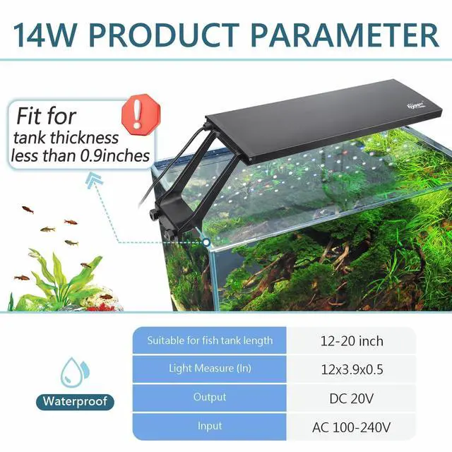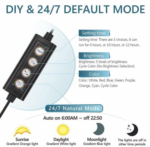 - Customizable DIY Mode: Personalize your aquarium! Set 3 types timer (6h/10h/12h), adjust brightness (5 levels), and choose from 7 colors (White, Red, Blue, Green, Purple, Orange, Cyan, Cycle) for unique effects.