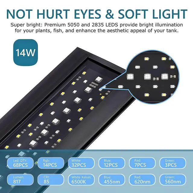 5 rows of lamp beads, LED number: 68pcs, the light surface is wider, the color is bright. High lumens, translucent fish tanks, and brighter plants. Long-term use does not decay, the light effect is pure and transparent, the life is long, and it can be used for tens of thousands of hours