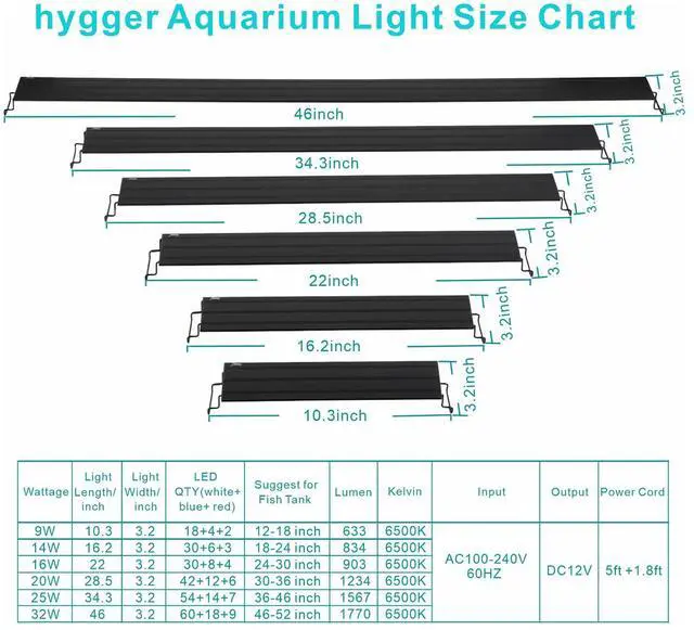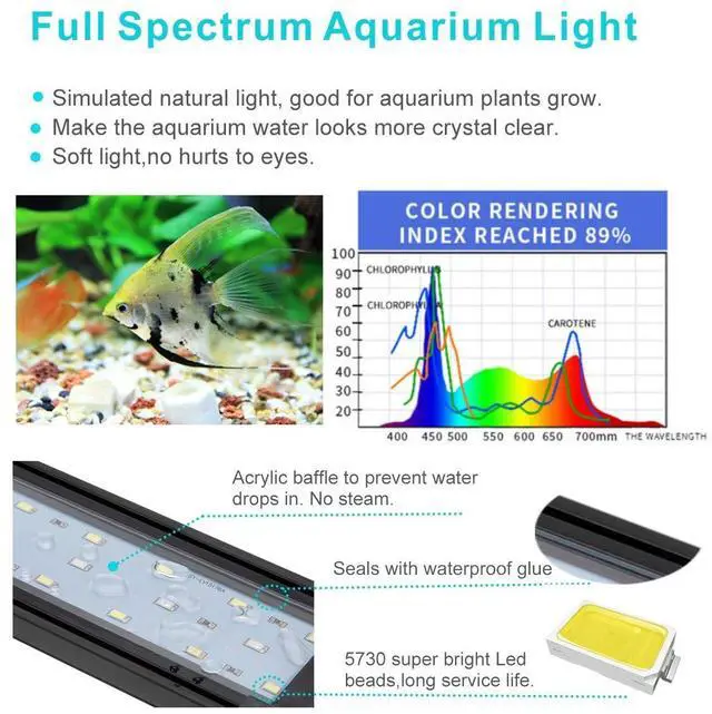 hygger high-quality led aquarium light with extendable mounting brackets is specially designed for most fish tank (12-52 inch) use. We use 5730 Leds, more bright and energy saving, soft light will make your aquarium water looks sparkly clean, the green or red plants under the water looks more bright and beautiful.