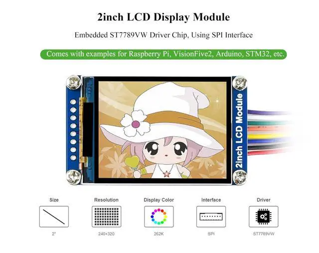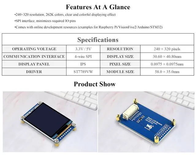 This is a general LCD display Module, IPS screen, 2inch diagonal, 240×320 resolution, with embedded controller, communicating via SPI interface. As a 2inch IPS display module with a resolution of 240 * 320, it uses an SPI interface for communication. The LCD has an internal controller with basic functions, which can be used to draw points, lines, circles, and rectangles, and display English, Chinese as well as pictures. We provide complete supporting Raspberry Pi demos (BCM2835 library, WiringPi library, and python demos), STM32 demos, and Arduino demos.