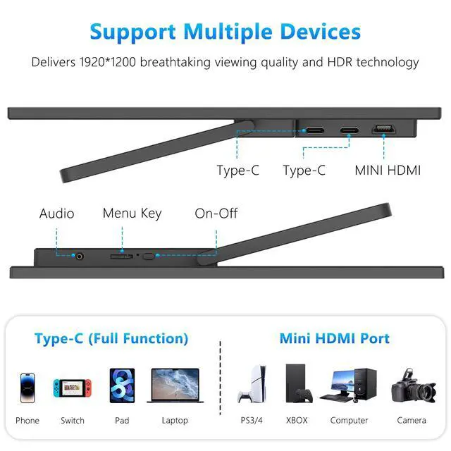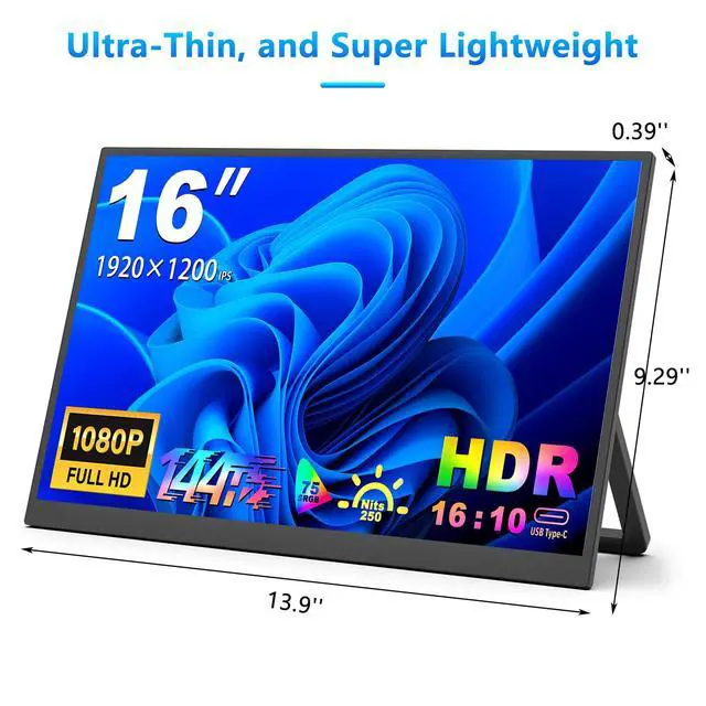 FHD 1200P portable monitor: This monitor using a 16'' advanced IPS screen with 144Hz, Delivers 1920*1200 breathtaking viewing quality and HDR technology, this portable gaming monitor has excellent color rendering ability, provide you the clearer, smooth, excellent performance in gaming/multimedia. It can effectively reduce blue light radiation damage, no flickering, eye-care, and make it easier to watch for a long time.