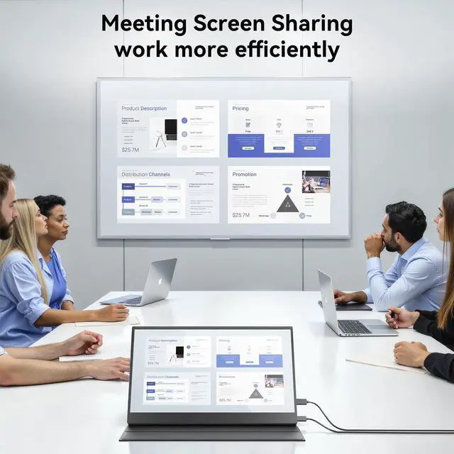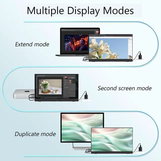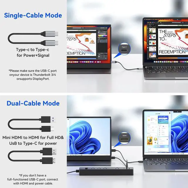 2. Laptops without full-featured Type-C port need connected via HDMl & USB C to USB A cable.
