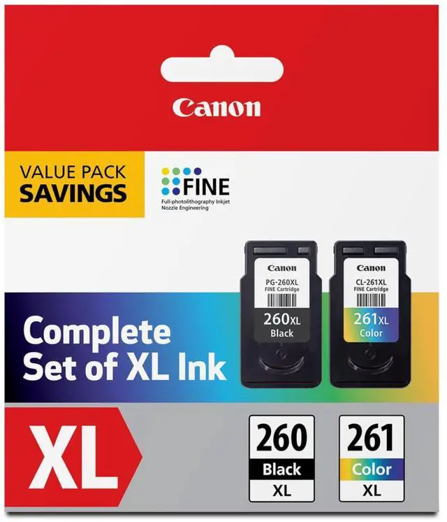 Value pack of 2 cartridges: PG-260 XL Black ink yields up to 400 pages, CL-261 XL color ink yields up to 300 pages. XL capacity ink cartridges can help you save money, print more when you need to and extend the time between replacing ink cartridges.