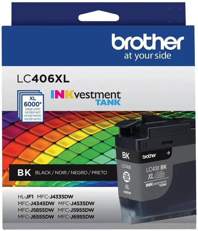 The Brother Genuine LC406XLBK black INKvestment Tank ink cartridge provides high quality, sharp inkjet prints you can consistently rely on for up to 6,000 pages(1).