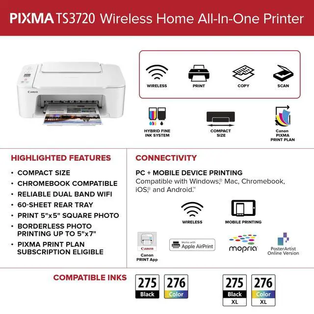 MOBILE DEVICE PRINTING: Print from your compatible mobile devices using the free Canon PRINT app, Apple AirPrint, and Mopria Print Service. The TS3720 also works with Chromebook, so you can print schoolwork and other documents hassle-free.