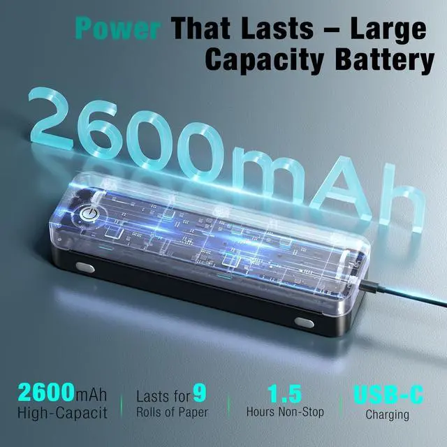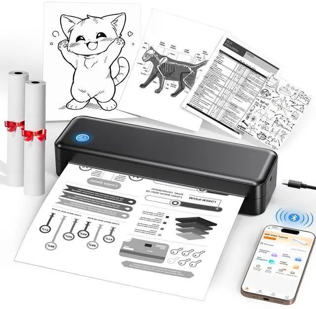 Inkless & Efficient Thermal TechnologyAdopting direct thermal technology, this wireless printer dispenses with ink cartridgesavoiding clogging and cleaning troubles for a more eco-friendly, economical experience. The kit comes with 2 rolls and 10 sheets of US Letter paper. Note it only supports black and white printing, requiring specific thermal paper (compatible with continuous labels, not gap labels) instead of regular copy paper.