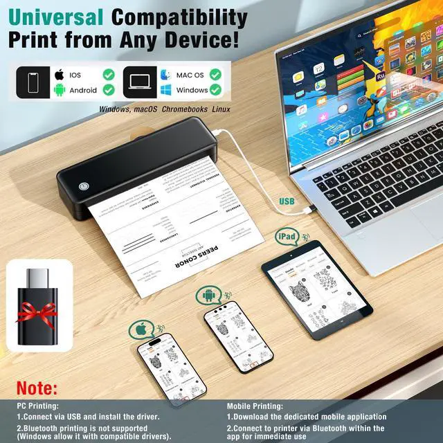 Bluetooth Connectivity & CompatibilityFor computers, install the driver first (downloadable via after-sales QR code or included USB drive) and then connect via USB or Bluetooth (Chromebooks do not support Bluetooth)note to use the drivers Bluetooth channel instead of the computers native Bluetooth. For smartphones, connect via Bluetooth through the AiYin APP for printing. Compatible with iOS 13+, Android, and PC.
