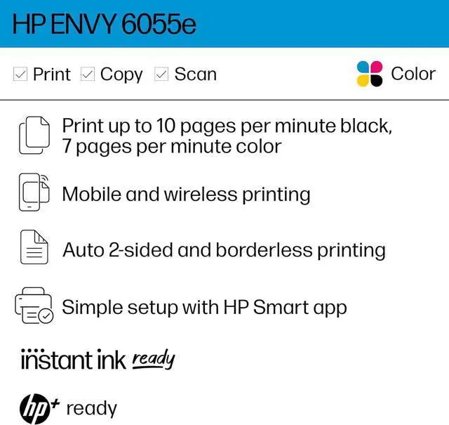 ENVY 6055e Wireless Color All-in-One Printer with 3 Months Free Ink with HP+ (223N1A) (Renewed)