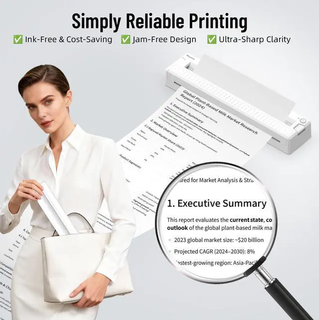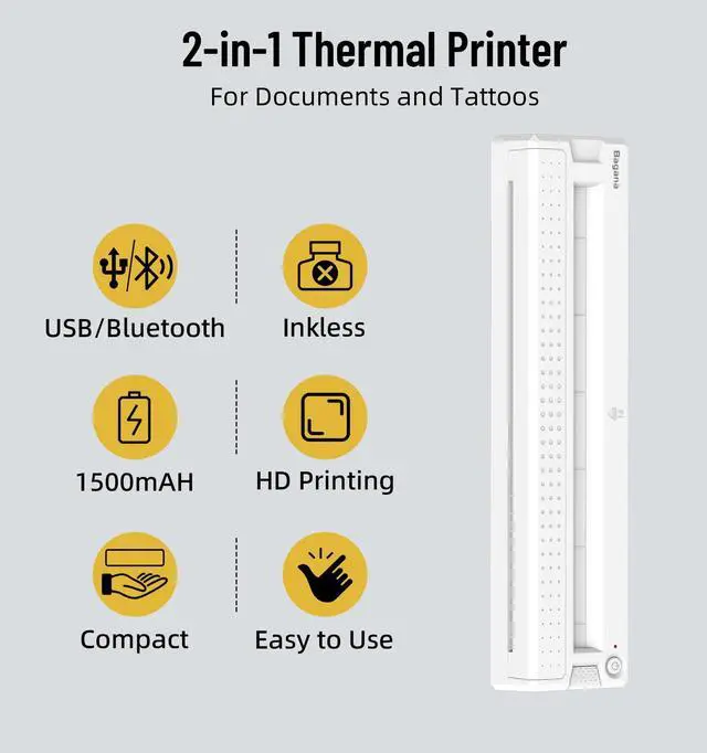 Bagana Wireless Portable Printer - No ink, rechargeable, compact size. It can quickly print urgent documents, invoices, boarding passes, etc.