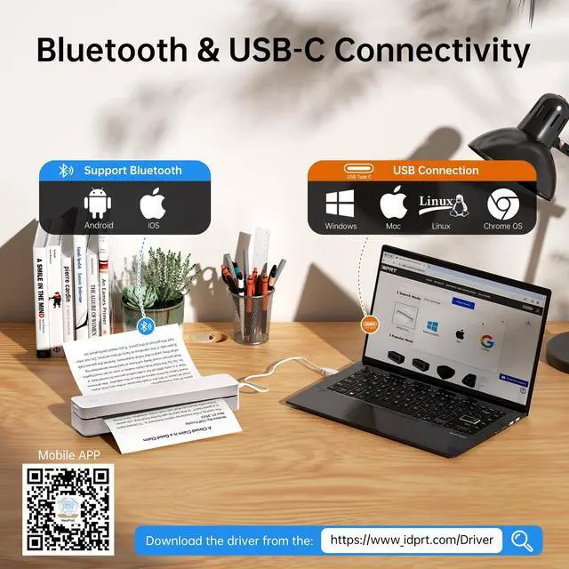 • Universal Device Compatibility: This Bluetooth printer connects seamlessly via Bluetooth or USB. It is compatible with phones (iOS, Android) and laptops (macOS, Windows, Linux, Chrome OS). The "HerePrint" app makes mobile printing effortless (download from the App Store or Google Play)
