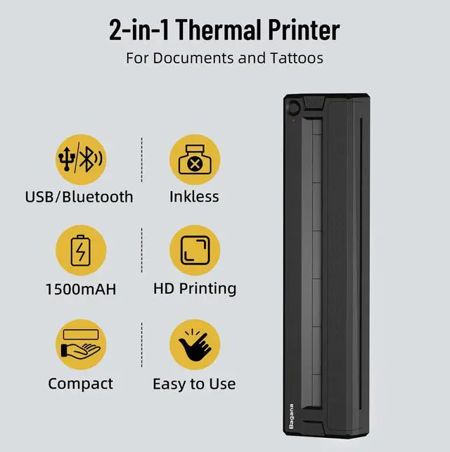 Bagana Wireless Portable Printer - No ink, rechargeable, compact size. It can quickly print urgent documents, invoices, boarding passes, etc.