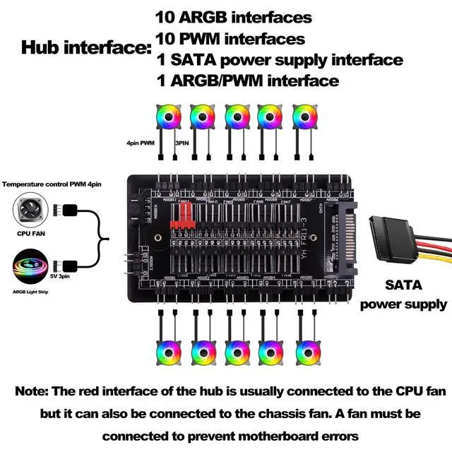 CybNemo 5V 3Pin ARGB Fan Hub & 4 Pin PWM Splitter 2 in 1 Case Fan Hub 10 Way Sync CPU Cooling Fan RGB Lighting Controller SATA Powered
