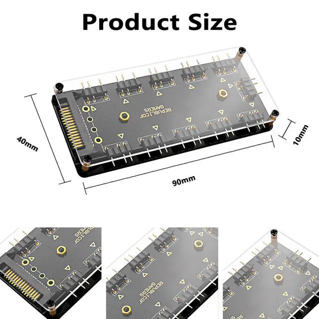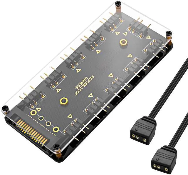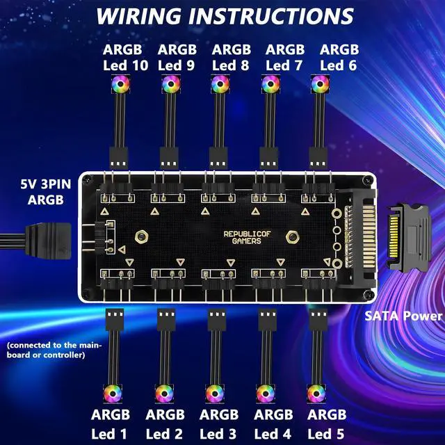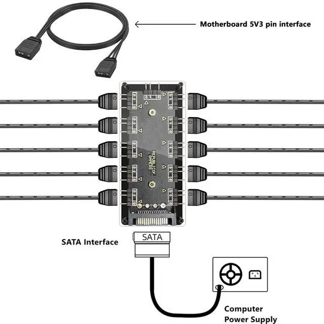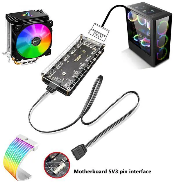 The function of this hub is to expand the scarce RGB interfaces on the motherboard. An RGB interface is divided into ten, used to control multiple RGB light strips and other devices.