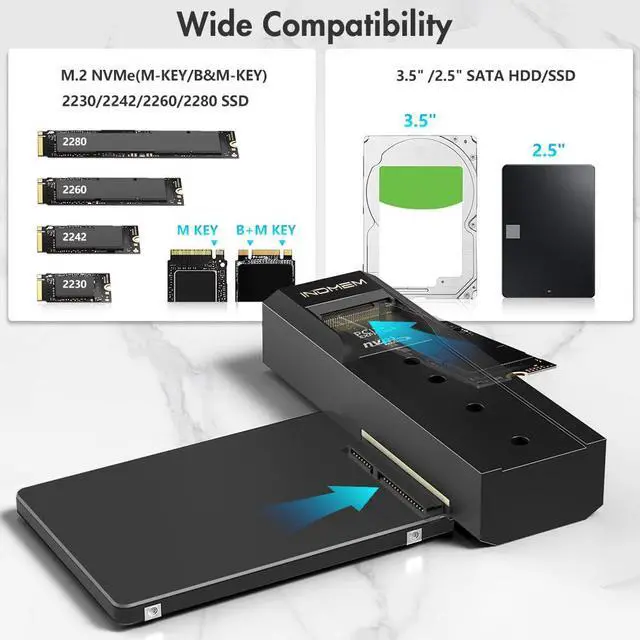 - Whether you are using M.2 or SATA hard drive, this M.2 hard drive enclosure can meet your needs, plug and play, no driver required, compatible with M.2 PCIe/NVMe SSD and SATA (NGFF) SSD in size 2242/2260/2280, also compatible with 2.5-inch SATA SSD and HDD