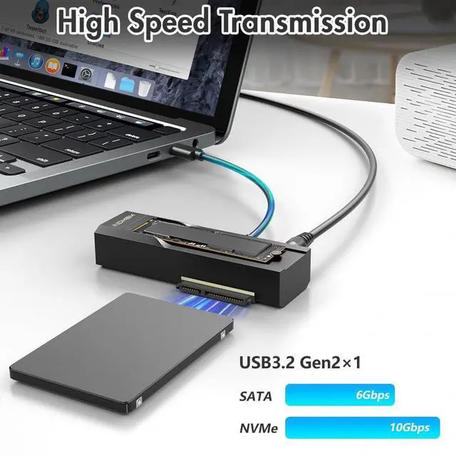 - This SSD enclosure supports SATA 6Gbps and NVMe 10Gbps ultra-fast transfer speeds with USB 3.2 Gen2 and is backward compatible with USB 3.1 and USB 3.0. This NVMe card reader adapter uses the USB-C interface for stable and efficient data transfer.