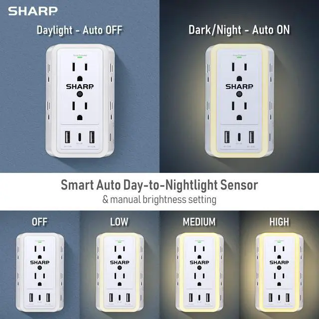 Designed with an innovative Daylight/Night Sensor that automatically turns on only when lighting in the room becomes dark. The brightness of the nightlight is adjustable with 4 levels of brightness (Off, Low, Medium, High) controlled by a touch sensor that lets you choose the right amount of light for your own needs. If the nightlight is not needed, it can be switched on/off manually.