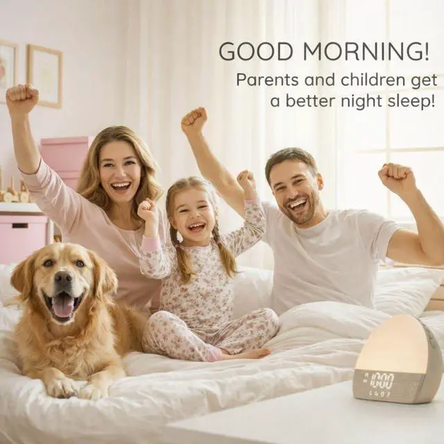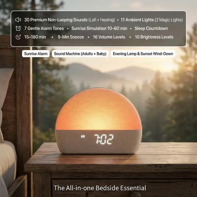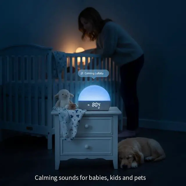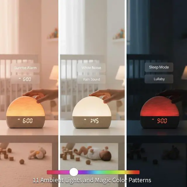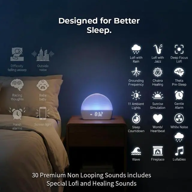 White Noise Sound Machine Sunrise Alarm Clock 30 Non-Looping Soothing Sleep Sounds with LoFi and Healing Music| 10-Color Ambient Light & Sunlamp | No App Screen Free Sleep for Baby Adults Kids