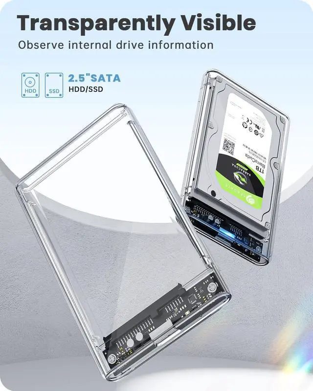 Transparent enclosure is made of imported ABS material with continuous improvement, Transparent HDD Enclosure has better heat dissipation than most black 2.5 inch HDD enclosures with about 35% better performance, transferring big data without heating up and protecting our HDD.