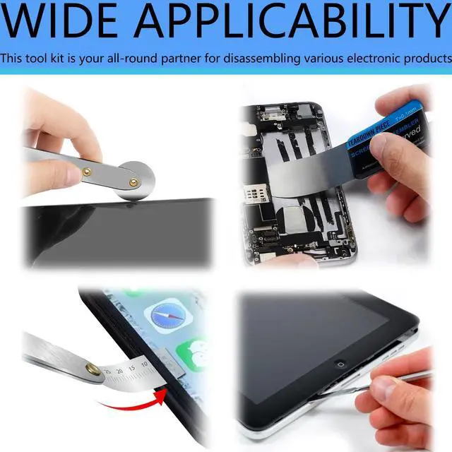 This versatile set includes an ultra-thin metal opening picks, 3 non-slip metal spudgers and 2 pry tools with clear markings.