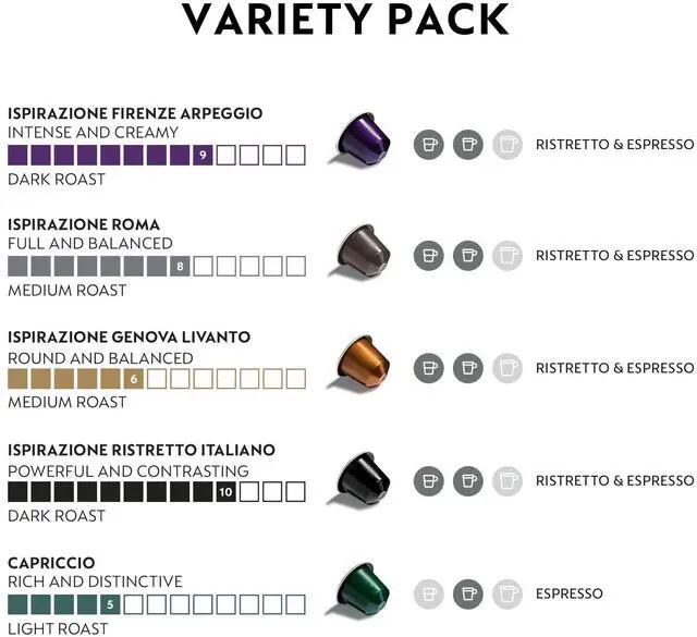 We offer ristretto (0.84 oz), espresso (1.35 oz), and lungo (3.7 oz).