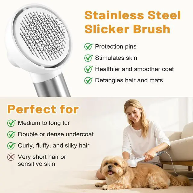 Low-Noise Design: Gentle stainless steel bristles glide through undercoats without scratching sensitive skin. Operating at just 7080 dB, this quiet dryer keeps pets calm and relaxedno more fear or anxiety during drying time.