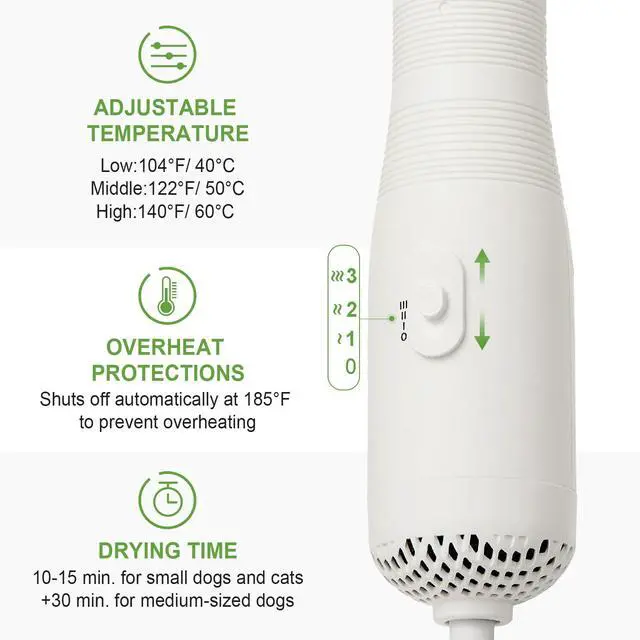 Turn drying into a stress-free moment for your pup. Our dryer's three customizable speeds let you personalize the airflow for their comfort—whether they have a fine coat or a dense, fluffy one. It's the safe and gentle way to a perfectly dry dog.