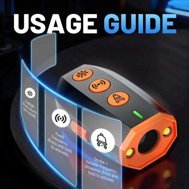 3-in-1 Multi-Function ModeFeatures variable-frequency ultrasonic emission + strobe light, fixed-frequency ultrasonic emission, and illumination modes, switchable with one button: the former effectively repels stubborn pets, the fixed-frequency mode gently deters without disturbing surroundings, and the flashlight provides nighttime illumination.