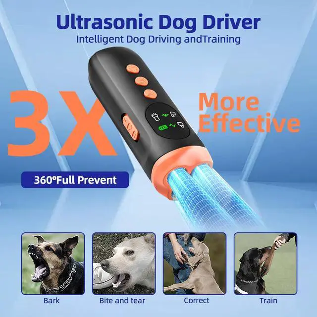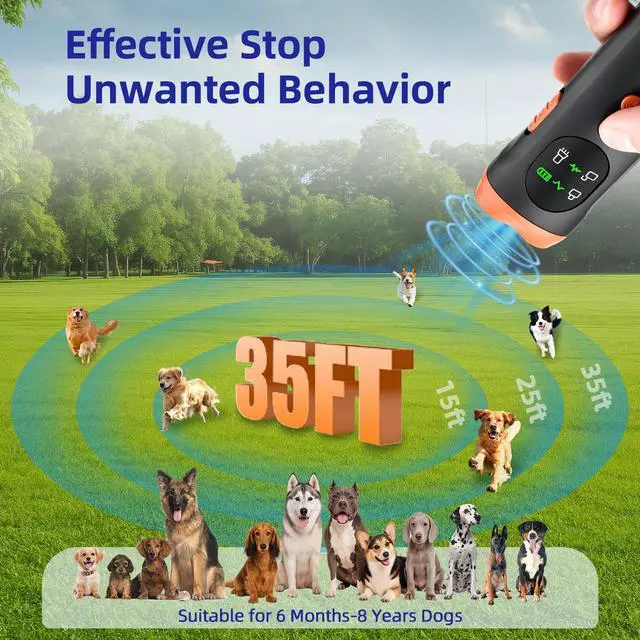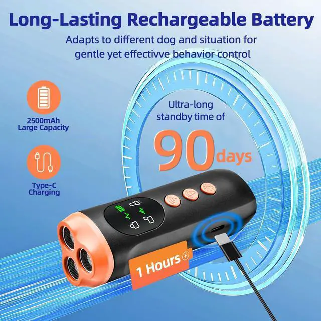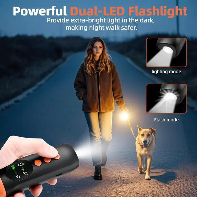 Multiple Training Modes Including Flashlight & Strobe for Enhanced Safety: Features three sound modesfixed ultrasonic, variable ultrasonic, and Peak Beepplus a bright flashlight and a strobe (frequency flashing) mode for night visibility and emergency deterrence. Suitable for small to large dogs aged 6 months to 8 years. USB-C rechargeable battery lasts up to 90 days on a 1-hour charge. Compact and lightweight for easy carrying, no assembly needed.