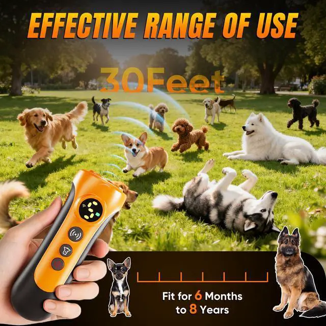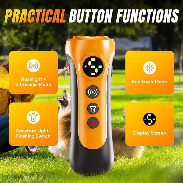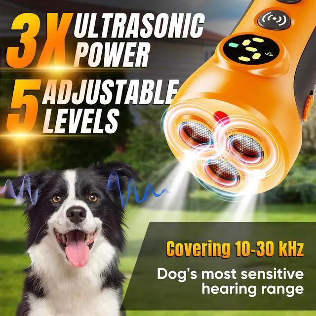 | Directions | Dog Bark Deterrent Device - 3X Ultrasonic Anti-Bark Device with 5 Adjustable Levels, 30ft Range for Indoor/Outdoor Use Rechargeable & Portable for Your or Neighbors Dog with Flashlight (Orange) |