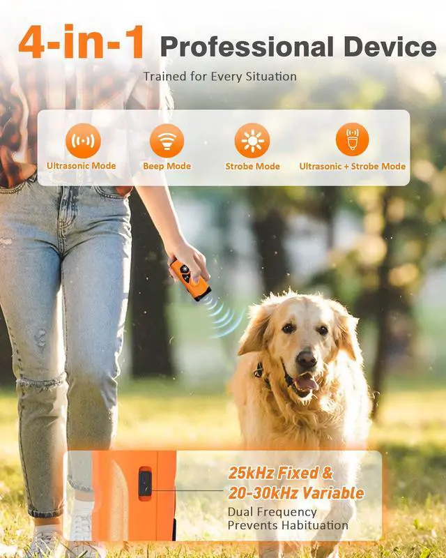 4-IN-1 MULTI-MODE BARK STOPPER: Our dog barking deterrent devices offer 4 modes: Ultrasonic (fixed 25kHz or variable 20-30kHz), Beep, Flashlight, and Ultrasonic + Strobe combo. It quickly corrects unwanted behaviors such as barking, biting, and jumping without harm, and works for 97% of dogs aged 6 months to 8 years with normal hearing, providing a humane dog-training solution