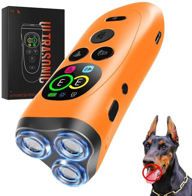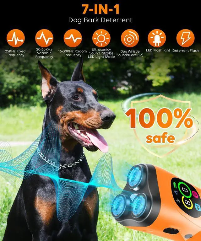 • 7-in-1 Effective Anti Barking Device: Our dog bark deterrent device features 3 ultrasonic frequencies (fixed 25kHz, variable 20-30kHz and random 1530KHz), ultrasonic+sound+strobe mode, beep mode(3 Levels), flashlight and deterrent flash, which can be used alternately for the best results,offering versatile training options to correct barking, jumping,other unwanted behaviors or stop neighbors dog bark that disturbs your peace safely and effectively