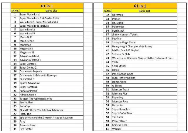 New and high quality. Compatible for both US/EU/JAP versions console. RPG games can be saved by the battery inside, But Action games have no saving function. 61 in 1. GBC games can't play on the GB game console.
